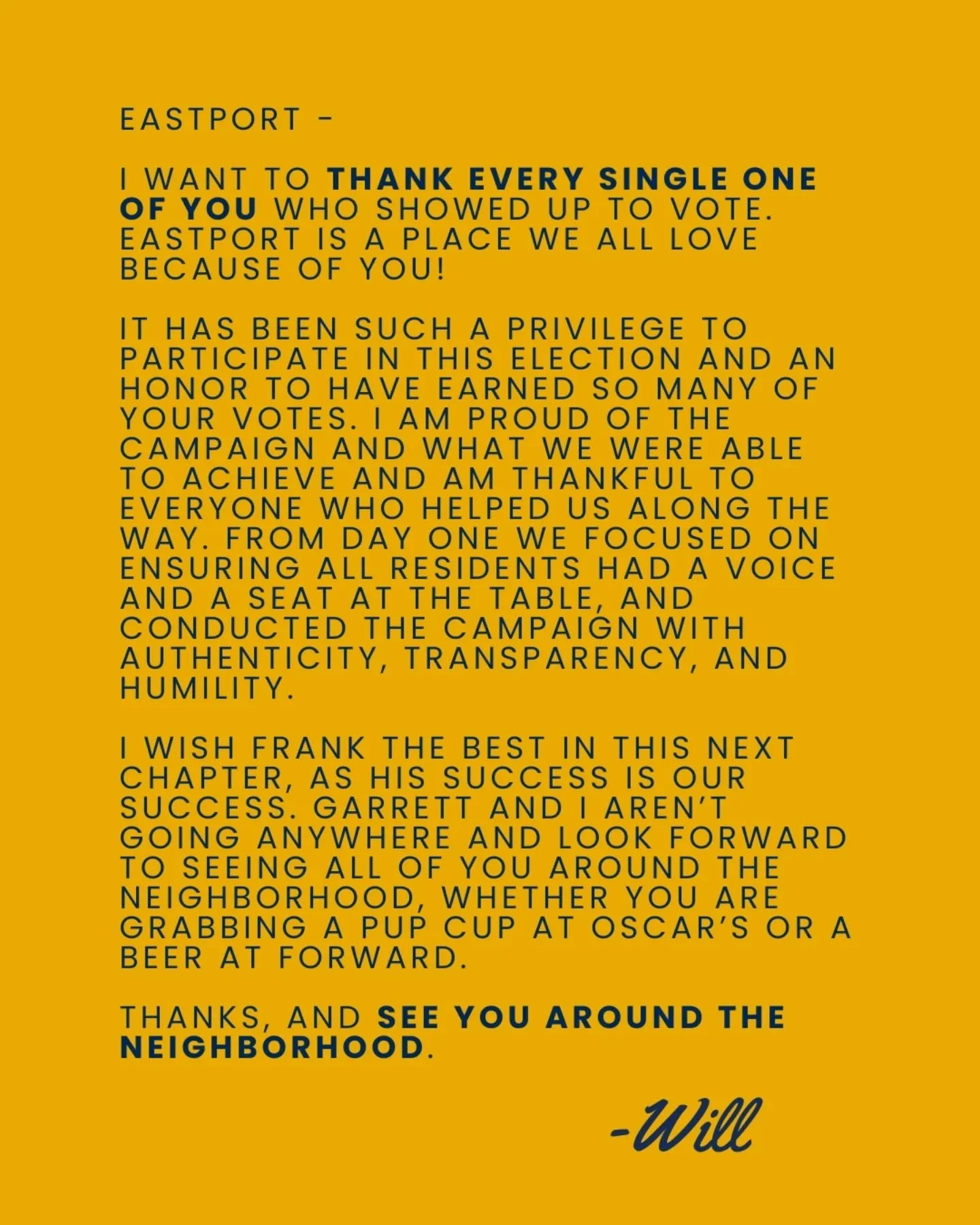 My campaign is about equally representing Eastport, shifting the balance of power back to the citizens, and holding the City accountable. We’ll take action to get things done, make our community safer, and welcome sustainable growth. As Alderman, I will encourage healthy debate while maintaining a mutual respect for all, in order to work toward a common vision for our collective future. Democracy is an ongoing experiment, underpinned by a willingness to take risks and give things a shot. We must aim for “working towards a ‘yes’” versus always defaulting to a “no.” Eastport’s greatest asset is its people - It’s time to get to work with a louder voice and fresh perspective for Eastport.